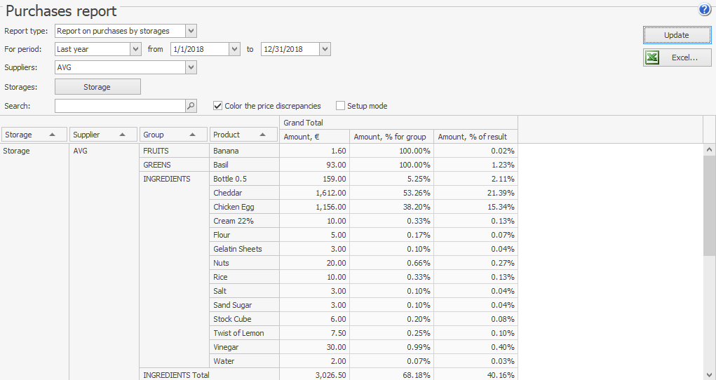 Raport zakupów według magazynów pokazuje udział dostarczonych towarów w całkowitym wolumenie zakupów oraz w grupie w określonym czasie. Dzięki temu możesz dowiedzieć się, ile wydałeś na towary w barze i kuchni w porównaniu do całkowitej kwoty zakupów, wyrażone procentowo.