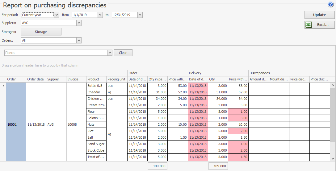 Różnica w cenie i ilości jest szacowana w bloku Rozbieżności. Elementy z wartościami zwiększonymi są wyróżnione na czerwono, a zmniejszonymi ‒ na zielono.