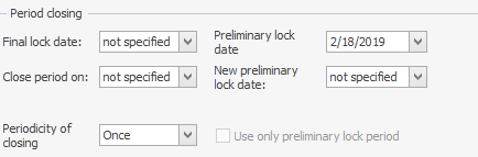 Do tego celu służy parametr Data wstępnego zablokowania. To ustawienie może być używane razem z poprzednim lub niezależnie. Data zamknięcia okresu nie może być wcześniejsza niż data blokady dokumentu.