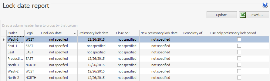 Pracownik HQ otrzymuje pełne informacje o blokadach danych, które miały miejsce we wszystkich punktach sieci. Zamknięty okres w punkcie oznacza, że dane są ustalone (zablokowane) i gotowe do eksportu. Raport Lock date report (sekcja Korporacja w Syrve HQ) służy do tych celów. Aby wyświetlić raport, należy posiadać uprawnienie „Konfiguracja raportu dat blokad” (B_VCPS).