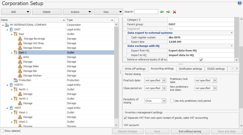 Zamknięcie okresu konfiguruje się za pomocą następujących parametrów. „Zamknięcie okresu do ustalonej daty tylko raz”, które jest konfigurowane w ustawieniach księgowości punktu sprzedaży lub korporacji w Syrve HQ. Informacje o blokowaniu danych we wszystkich punktach sieci znajdują się w raporcie „Lock date report” w sekcji Korporacja Syrve HQ.
