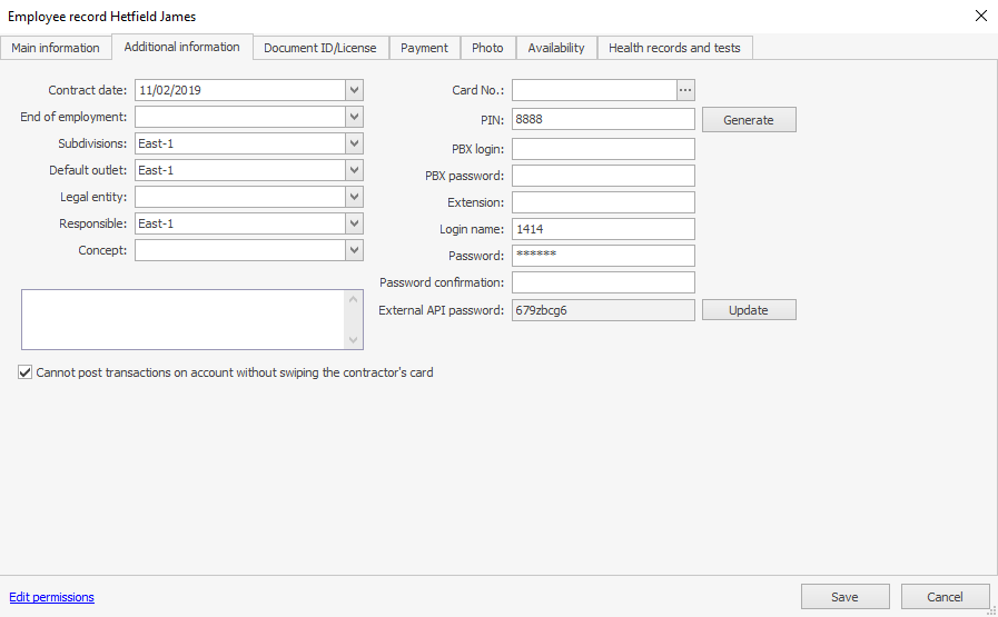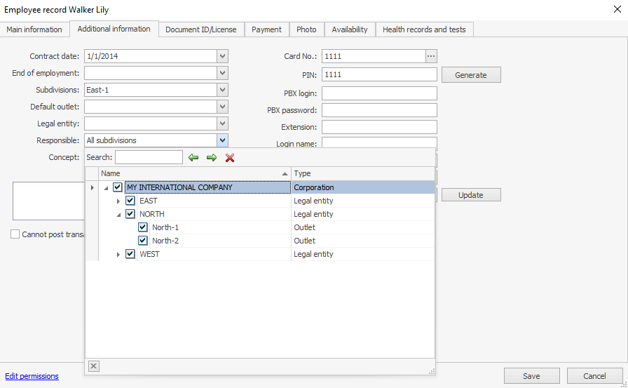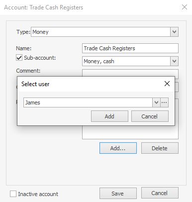 Usuńmy odpowiedzialność Kirka za lokalizację. W tym celu odznacz wszystkie pola Odpowiedzialny na karcie Dodatkowe informacje w pliku pracownika. Teraz może przeglądać i edytować konto „Kasy handlowej”, ale nie może tworzyć transakcji (konto nie pokazuje szczegółów i nie może wybrać sklepu, do którego należy transakcja).