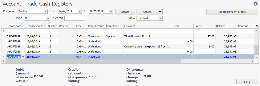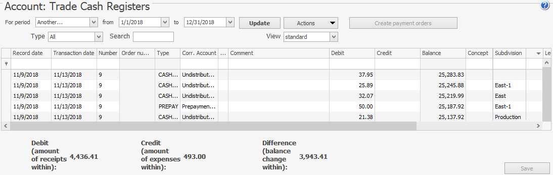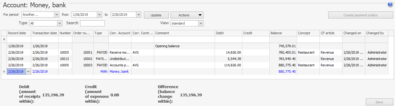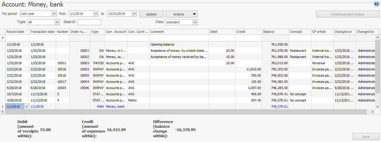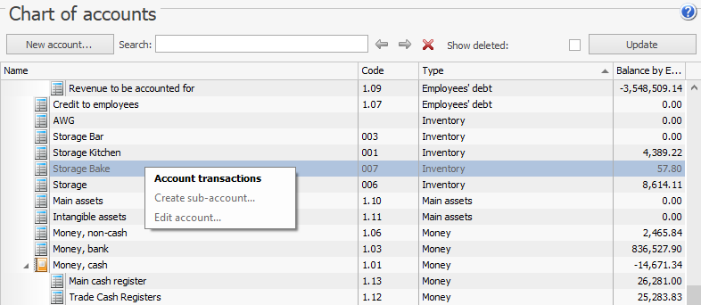 Jeśli pracownik ma uprawnienia „Wyświetl plan kont” (B_VCOA) oraz „Otwórz konto” (B_MCB), może uzyskać dostęp do Planu kont i otworzyć listę transakcji poprzez podwójne kliknięcie lub użycie pozycji w menu kontekstowym — Transakcje konta. Jeśli ma tylko uprawnienie B_MCB, pracownik musi przejść do Finanse > Otwórz konto i wybrać wymagane konto, aby zobaczyć transakcje.