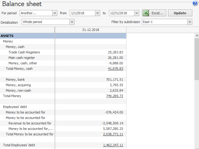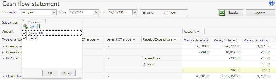 W Planie kont widzi tylko saldo East-1. Bilans, raport zysków i strat oraz sprawozdanie przepływów pieniężnych pokazują tylko kwoty należące do East-1, a jest to jedyny lokal dostępny w filtrze Oddział.