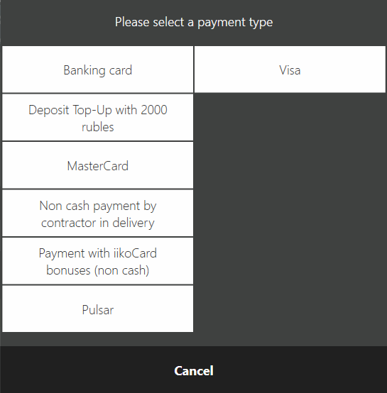 - Wybierz metodę płatności, na przykład Visa, MasterCard. Metody te zależą od typów płatności utworzonych w Syrve Office.