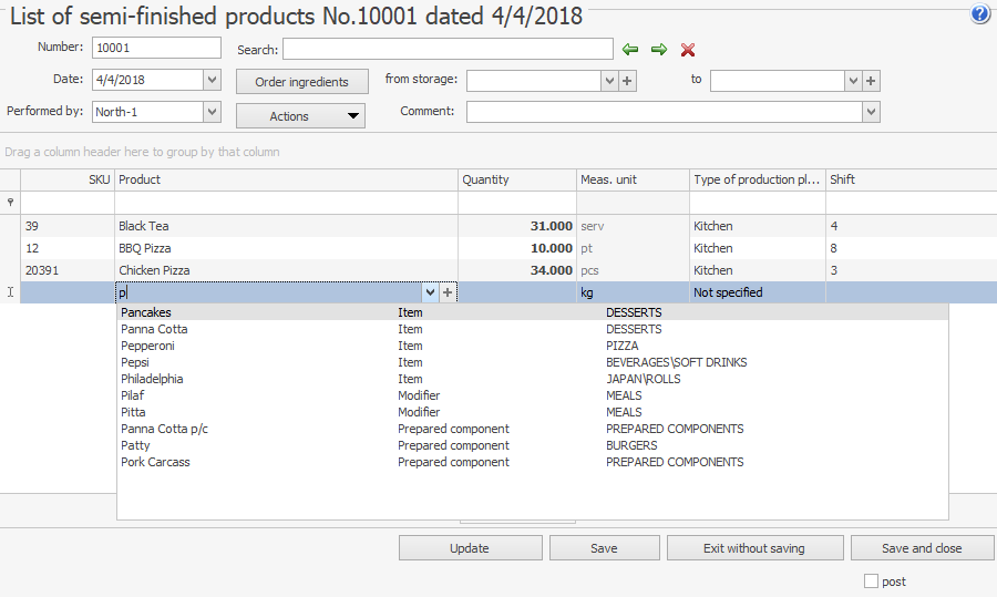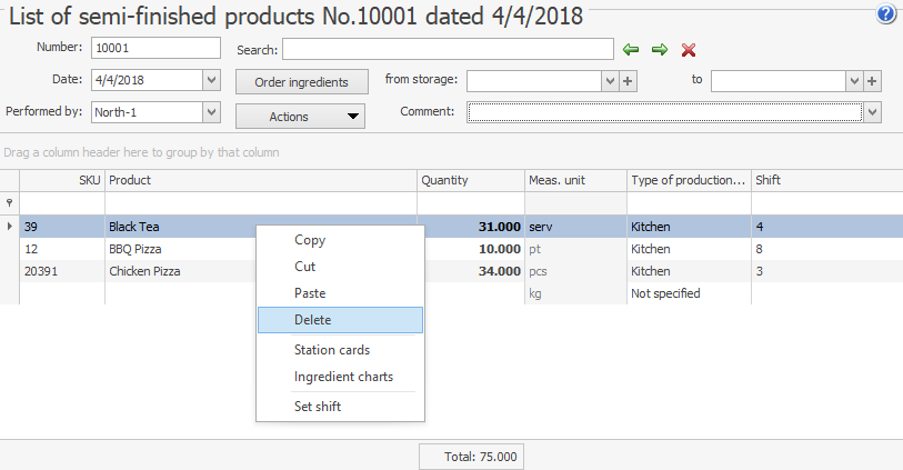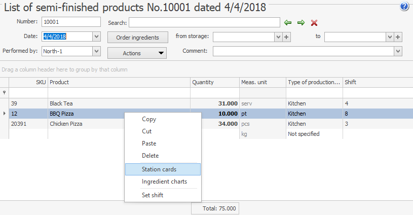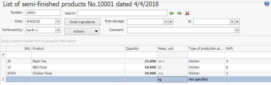 Zostanie wygenerowany dokument o nazwie Lista półproduktów, który pokaże pozycje pogrupowane według sklepów. Wymagana ilość posiłków do przygotowania zostanie automatycznie obliczona na podstawie kart stanowisk. Możesz zmienić te wartości w polu Ilość.