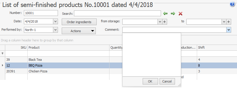 Aby dodać pozycję, umieść kursor w polu SKU lub Produkt w pustym wierszu i wybierz pozycję z listy magazynowej. Lista zawiera wszystkie pozycje magazynowe następujących typów: „Pozycja” i „Półprodukt”. Następnie wprowadź ilość w wymaganych jednostkach miary.