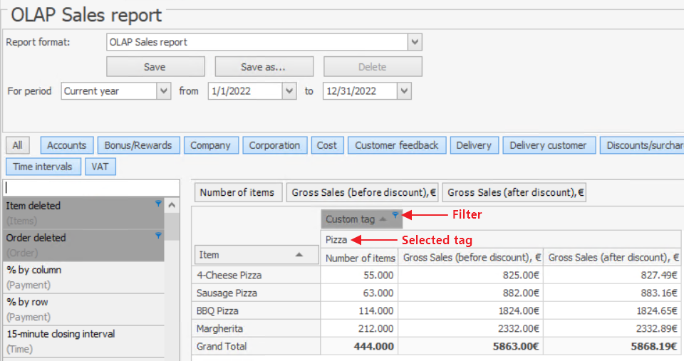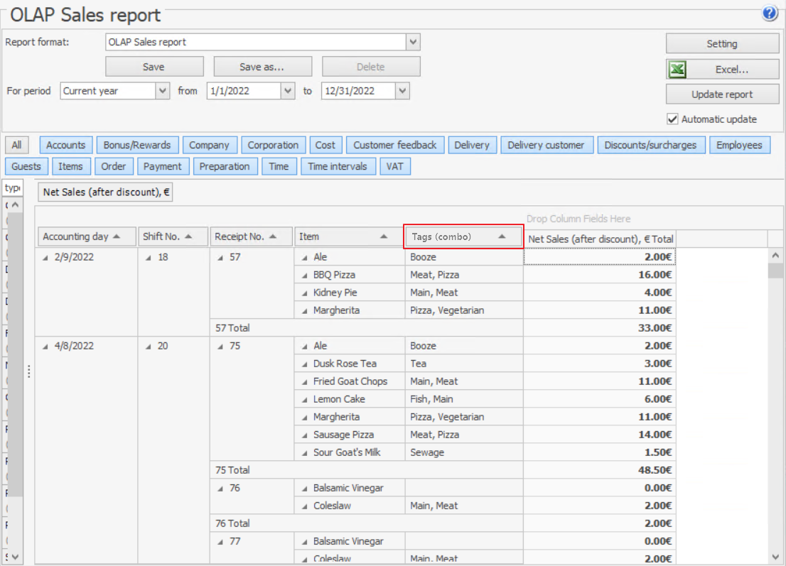 Możesz uznać pola Niestandardowe Tagi (combo) oraz Niestandardowy Tag w Raporcie Sprzedaży OLAP za przydatne, gdy potrzebujesz śledzić, do jakiej kategorii (lub tagu) należą sprzedane przez Ciebie przedmioty. W ten sposób możesz określić, które przedmioty są Twoimi najlepiej sprzedającymi się produktami, które sprzedają się słabo oraz jakie działania można podjąć, aby obniżyć koszty i zwiększyć sprzedaż.