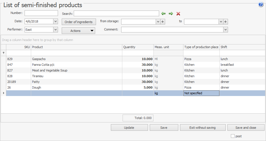 Wypełnij pole Wykonawca – punkt sprzedaży odpowiedzialny za przygotowanie półproduktów. Wprowadź dodatkowe informacje w polu Komentarz. Dodaj do tabeli pozycje lub półprodukty, które mają zostać ugotowane. Określ Ilość półproduktów. Pola Jedn. miary i Typ miejsca produkcji są automatycznie uzupełniane na podstawie karty asortymentowej. Dla każdej pozycji określ Zmianę, podczas której ma być ugotowana. Wpisz nazwy zmian roboczych – będą przechowywane i dostępne do wyboru. Jeśli planujesz wyeksportować zapotrzebowanie na żywność, w tej kolumnie określ, czy jest to śniadanie, obiad czy kolacja. Aby określić zmianę dla wielu wierszy jednocześnie, zaznacz je i kliknij Ustaw zmianę w menu skrótów. Zapisz dokument.