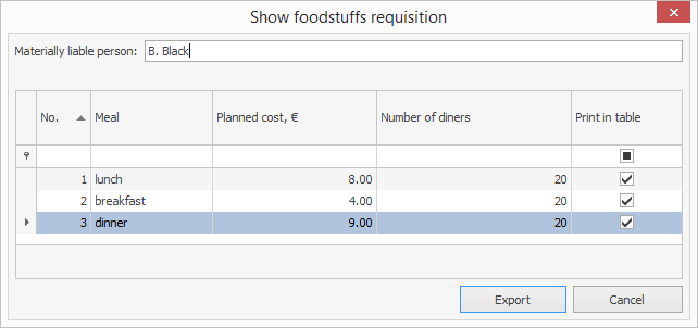W głównej tabeli zapotrzebowania na żywność wszystkie pozycje są pogrupowane według posiłków. Każdy posiłek ma określoną liczbę porcji oraz ich wagę wyjściową na osobę. Jeśli na liście półproduktów dana pozycja występuje wielokrotnie w obrębie jednego posiłku, zostanie podana w jednej kolumnie, a ich liczba zostanie zsumowana w zapotrzebowaniu na żywność.