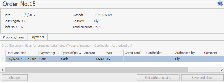 Na karcie Płatności podawane są informacje o typach i kwotach płatności otrzymanych za to zamówienie. Jeśli zamówienie zostało opłacone kartą bankową, można zmienić typ karty. Aby to zrobić, wybierz wiersz z płatnością i kliknij przycisk Zmień. Następnie w otwartym oknie Edytuj płatność wybierz wymagany typ i kliknij przycisk Zapisz.