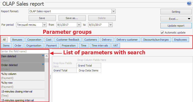 Raport OLAP różni się od standardowego raportu tym, że definiujesz parametry, na podstawie których chcesz uzyskać informacje. W Syrve raporty te mogą być tworzone do analizy dowolnego rodzaju danych. Na przykład kwoty przychodów, popularne dania, wyniki pracowników, wykorzystanie produktów itp.