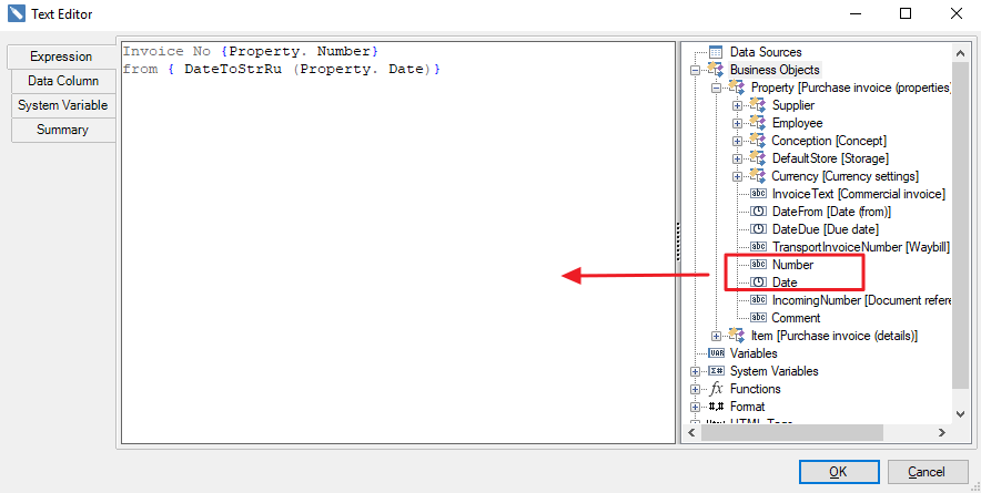 - Aby wyświetlić datę i numer faktury, kliknij Obiekty biznesowe po prawej stronie okna, a następnie Właściwości [Faktura zakupu (properties)] i przeciągnij Numer [Number] oraz Data [Date] do pola właściwości.