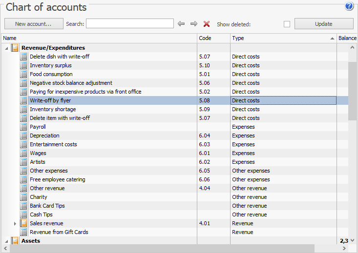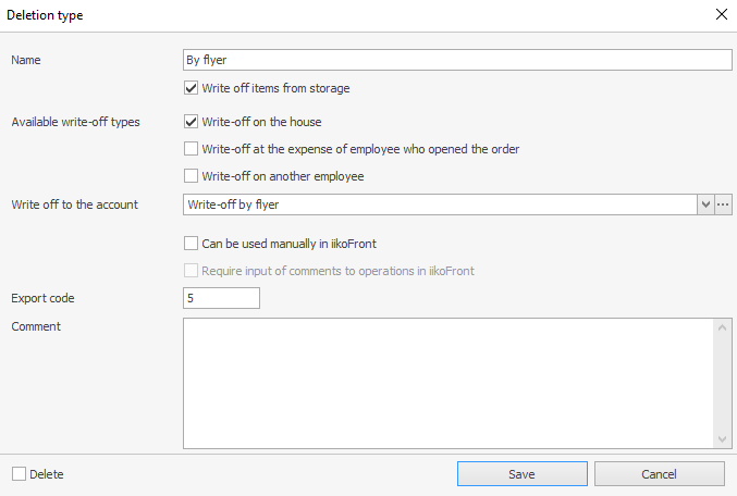 - Skonfiguruj typ usunięcia "Według ulotki" z nazwą "Według ulotki” oraz odpis pozycji ze stanu magazynowego na konto "Odpis według ulotki". Odznacz opcję Można używać ręcznie w Syrve POS (szczegóły znajdziesz w Warunki konfiguracji usuwania).