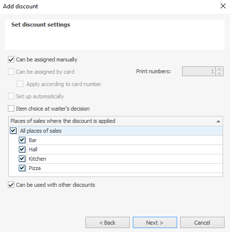 - Rabat ulotkowy można wybrać tylko ręcznie. Jeśli zaznaczono Można ustawić ręcznie, rabat ulotkowy będzie dostępny w Syrve POS w momencie naliczania rabatu dla konkretnego zamówienia.