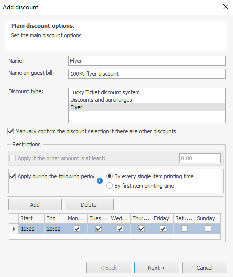 - Aby rabat ulotkowy był stosowany tylko w określone dni i godziny, zaznacz opcję Stosuj tylko w następującym okresie i skonfiguruj okres stosowania rabatu.