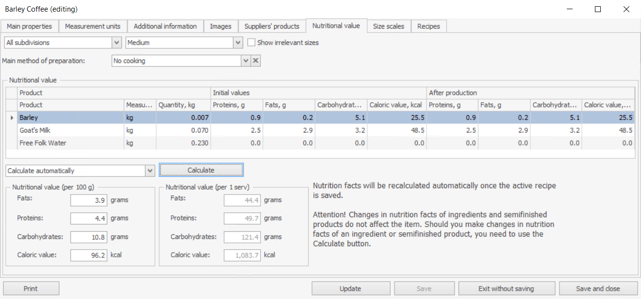 Tutaj możesz wybrać dwa ustawienia: Obliczaj automatycznie oraz Przeliczaj ręcznie. Pierwsza opcja automatycznie przelicza wartość odżywczą pozycji po zamknięciu rekordu pozycji, pod warunkiem że dokonano jakichkolwiek zmian w składnikach pozycji.