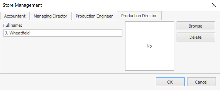 W zakładce Właściwości wpisz pełne imię i nazwisko pracownika w polu odpowiadającym jego stanowisku (Dyrektor zarządzający, Księgowy, Inżynier produkcji lub Dyrektor produkcji).