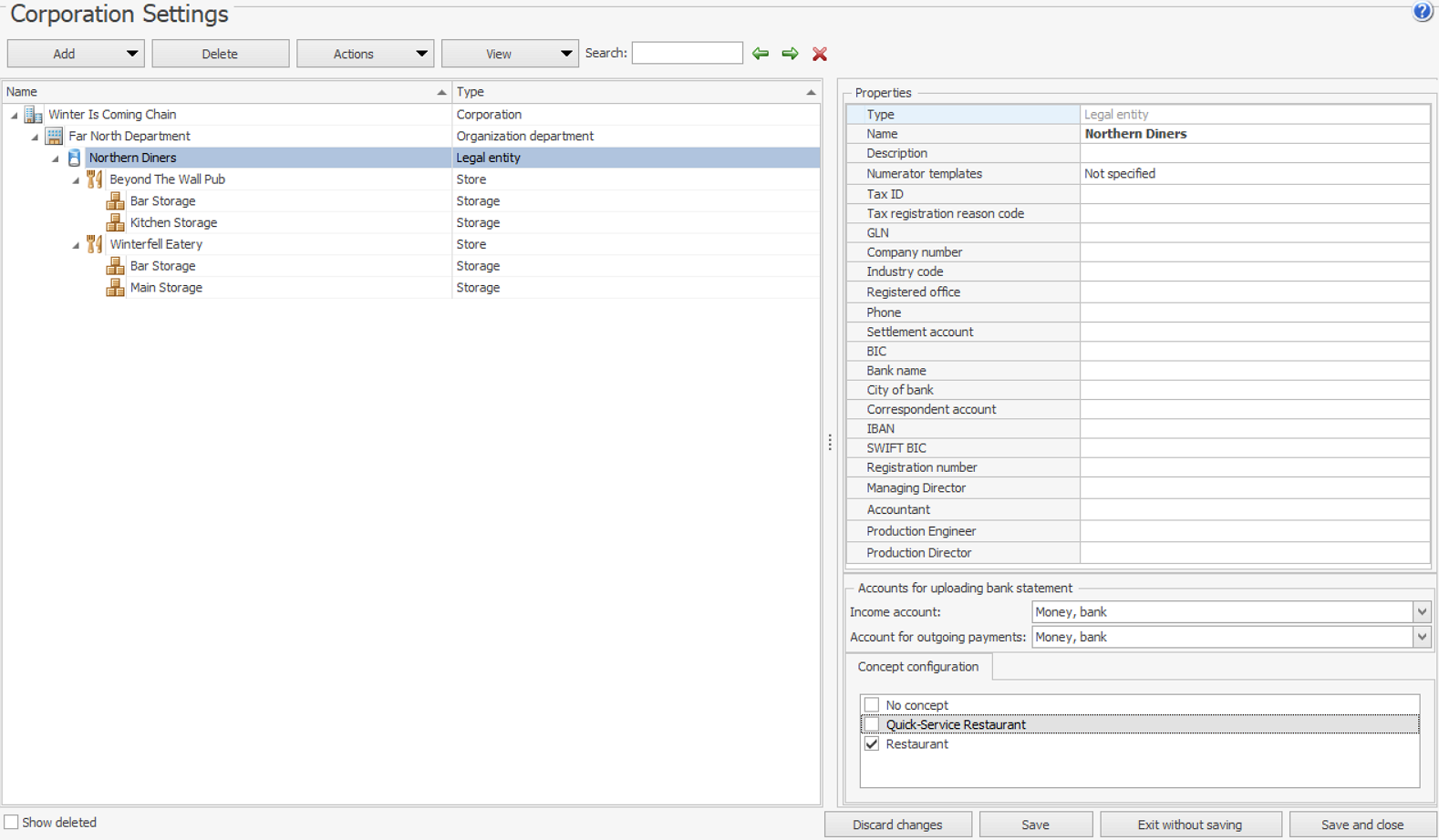 - W bloku Konfiguracja koncepcji wybierz koncepcje, które mogą być używane w punktach sprzedaży. To ustawienie umożliwia ograniczenie listy dostępnych opcji dla „Raportów zysków i strat” według koncepcji. Ponadto roczna analiza planu/wykonania dla każdego punktu sprzedaży ma własną listę koncepcji. Te ograniczenia można dostosować na poziomie jednostki prawnej w bloku Konfiguracja koncepcji. Punkty sprzedaży dziedziczą ustawienia koncepcji jednostki prawnej.