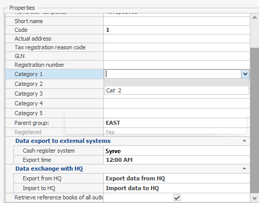- Jeśli domyślny zestaw właściwości jest niewystarczający, użyj dodatkowych i nadaj im nazwy według własnego uznania. Załóżmy, że potrzebujesz analizować sprzedaż według podziału geograficznego. W tym celu potrzebujesz specjalnej właściwości, np. „okręg federalny”, której brakuje na liście. Aby dodać tę właściwość, użyj jednego z pól Kategoria 1-5. W przyszłości pola te mogą być używane do dodatkowej analizy. Na przykład w raportach OLAP zobaczysz pole Okręg Federalny zamiast Kategoria 1, które możesz wykorzystać do grupowania lub filtrowania danych raportu, np. według okręgu. Aby skonfigurować pole, wykonaj następujące kroki: