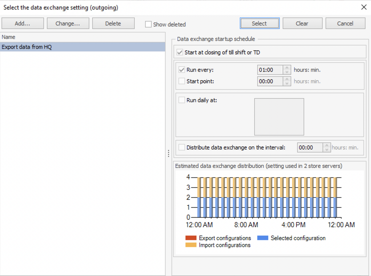 Jeśli chcesz uruchomić wymianę danych jeden lub kilka razy dziennie o określonej godzinie, zaznacz pole Uruchom codziennie o, określ czas i kliknij Dodaj. Wszystkie trzy ustawienia harmonogramu mogą być używane jednocześnie. Na przykład wymiana danych może rozpoczynać się automatycznie co 2 godziny, codziennie o 14:00 i 18:00, a także po zamknięciu zmiany kasy lub dnia transakcyjnego.