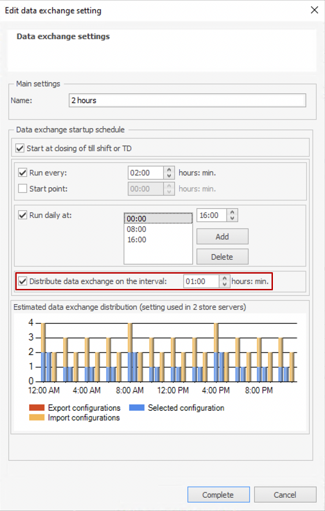 Po włączeniu rozłożenia rozpoczęcie wymiany danych dla wszystkich punktów sprzedaży w sieci jest równomiernie rozłożone na cały przedział czasowy (lub jego część, jeśli przedział jest długi). Każdy punkt sprzedaży otrzymuje swój własny numer kolejki wymiany i nie próbuje inicjować wymiany jednocześnie z innymi punktami.