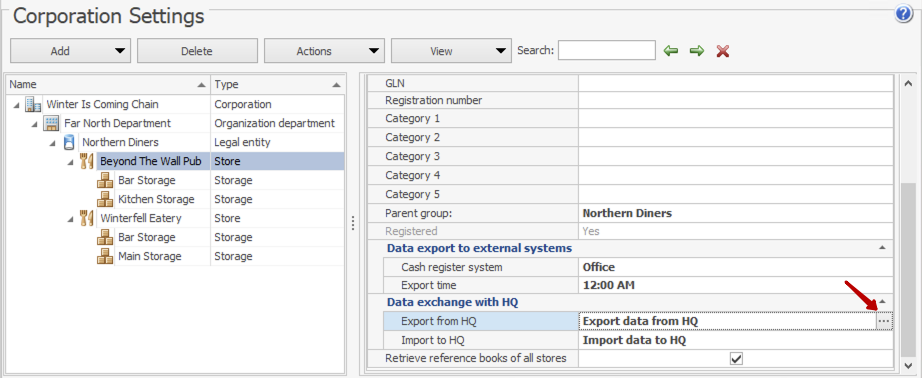 W Syrve HQ możesz przenosić punkty sprzedaży z jednego podmiotu prawnego do innego. Po przeniesieniu punktu sprzedaży w drzewie musisz wyjść z Syrve Office i uruchomić go ponownie, w przeciwnym razie wymiana danych nie będzie działać poprawnie. Nazwa nowego podmiotu prawnego pojawi się w ustawieniach punktu sprzedaży dopiero po ponownym uruchomieniu Syrve Office. Aby przenieść punkt sprzedaży do innego podmiotu prawnego, przeciągnij ikonę i upuść ją w wymaganej grupie w ustawieniach korporacji.
