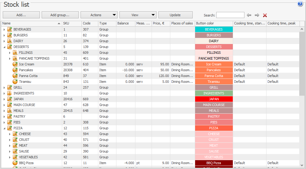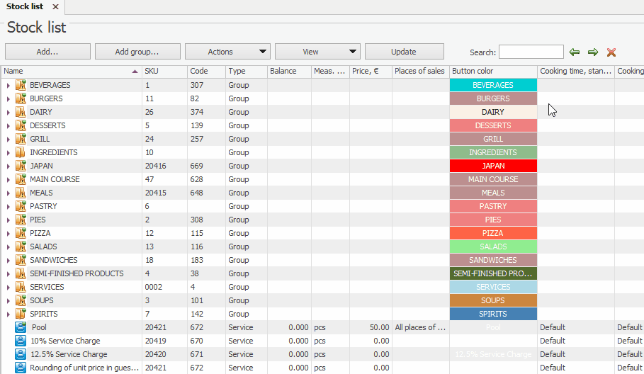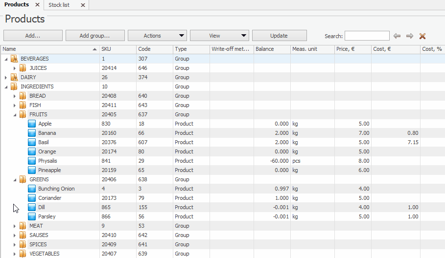 W Syrve elementy listy magazynowej to produkty, pozycje menu, półprodukty, modyfikatory oraz usługi. Aby otworzyć pełną listę magazynową, przejdź do Zarządzanie zapasami > Lista magazynowa.