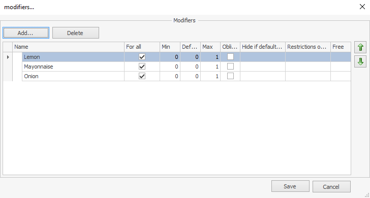 Modyfikatory to opcje pozycji menu lub dodatki takie jak przyprawy. Na przykład stek ma kilka modyfikatorów dotyczących stopnia wysmażenia, a lody mogą mieć różne polewy. Modyfikator może mieć przepis i składać się ze składników.
