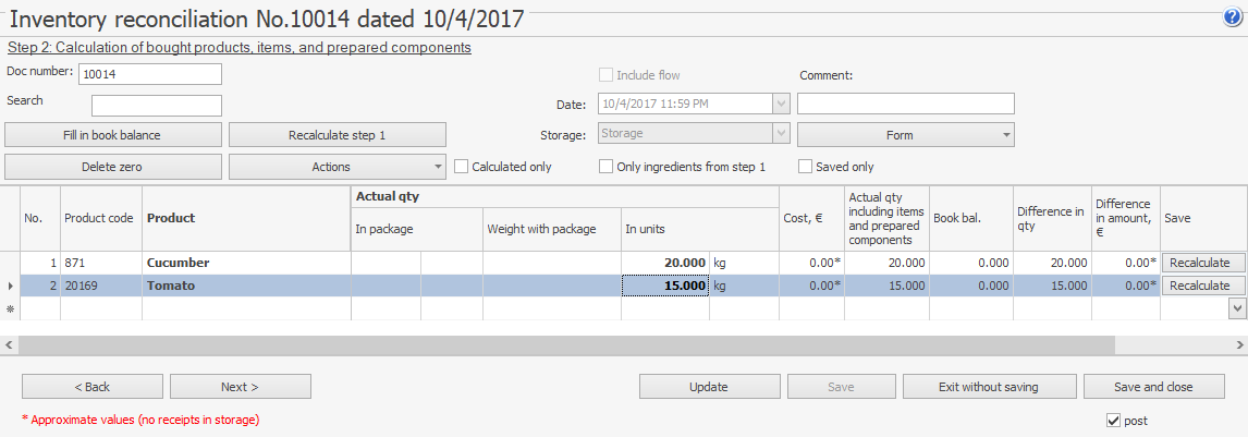 Aby skompensować ujemne saldo powstałe po zaksięgowaniu dokumentu przesunięcia wewnętrznego (patrz Przykład 1) i protokołu likwidacji, potrzebujesz 11 kg pomidorów, 17 kg ogórków w tym magazynie.