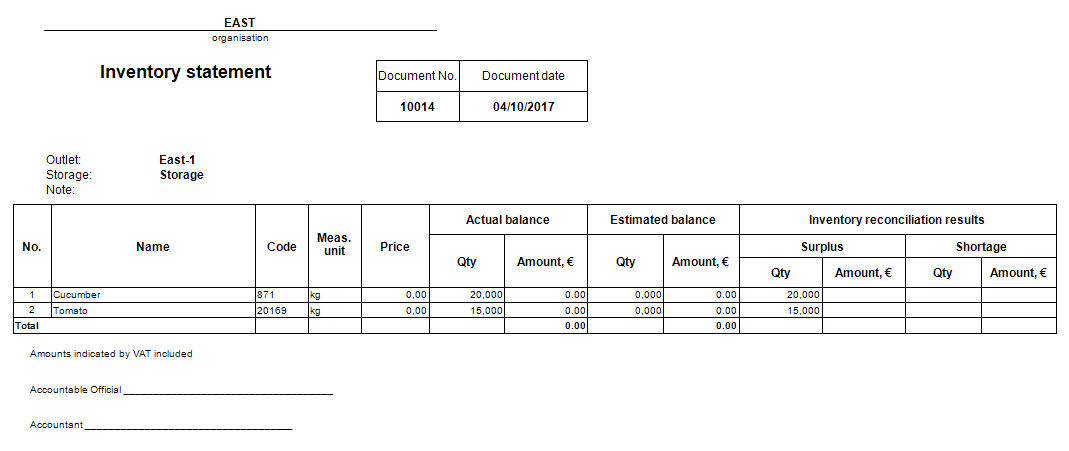 Przejdź do Kroku 3 i utwórz oświadczenie o stanie zapasów (Drukuj – Oświadczenie o stanie zapasów). W oświadczeniu o stanie zapasów jest nadwyżka: 15 kg pomidorów i 20 kg ogórków.