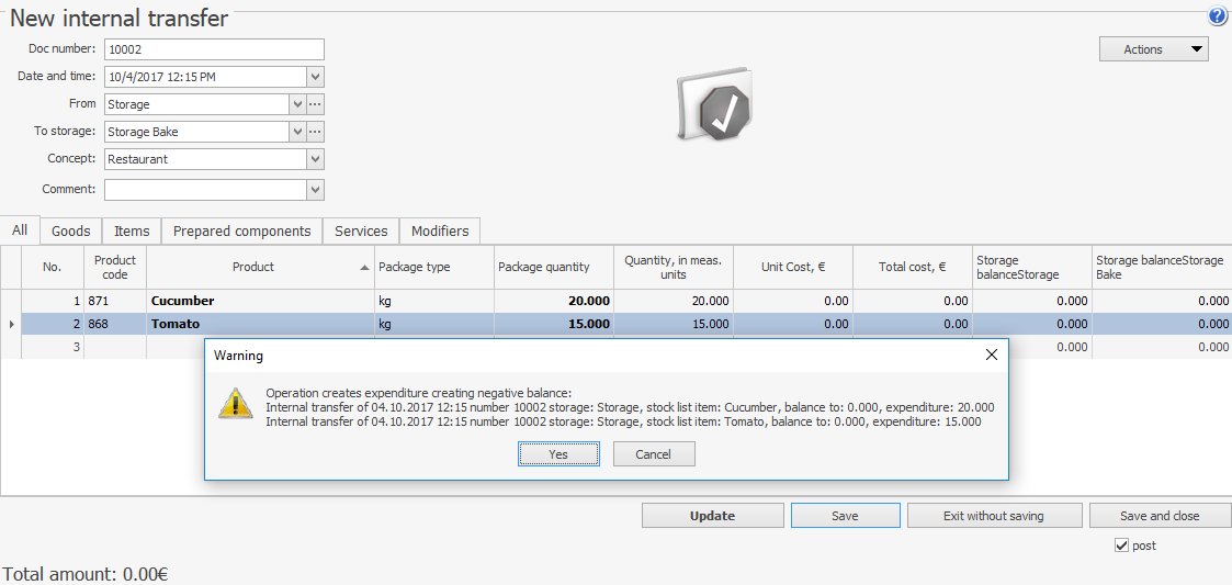- Po wypełnieniu dokumentu kliknij Zapisz i zamknij (lub Zapisz), a następnie Tak. Zostanie utworzone automatyczne uzgodnienie inwentaryzacyjne, które skoryguje ujemne saldo, a dokument przesunięcia wewnętrznego zostanie zaksięgowany.