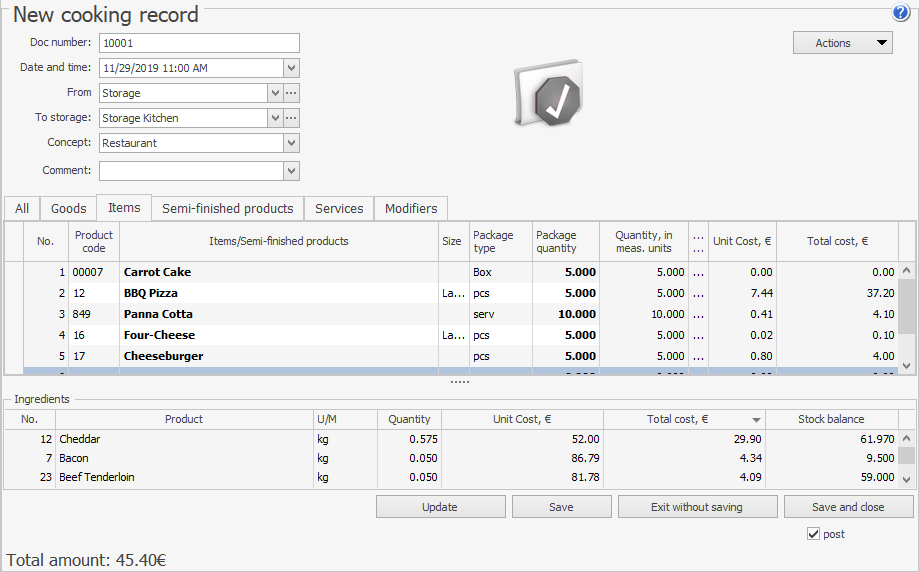 Rejestr gotowania potwierdza, że dany element menu lub półprodukt jest ugotowany (dostępny). Tak więc, gdy dokument jest zaksięgowany, system rozlicza wszystkie użyte składniki.