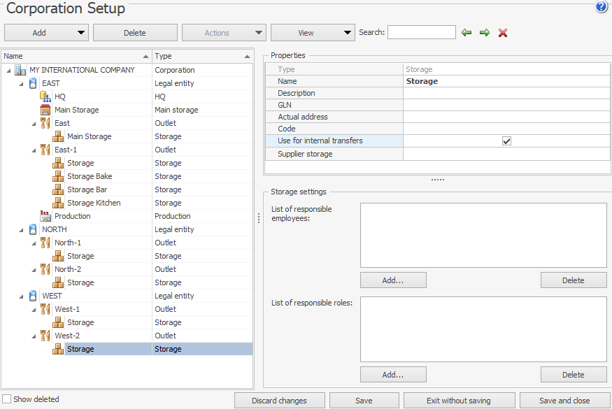 - Wybierz jednostkę organizacyjną na drzewie korporacji, do której należy magazyn, i kliknij Dodaj > Magazyn. Po prawej stronie okna pojawi się panel ustawień magazynu.