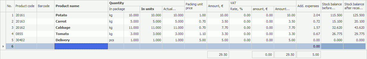 | Nr. | Nazwa | Cena, € | Ilość | Razem, € | Współczynnik | Dodatkowe koszty, € |