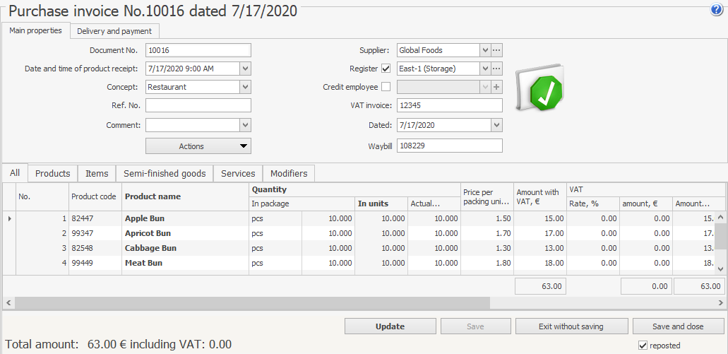 - Kliknij Zapisz i zamknij, gdy wszystkie towary zostaną wprowadzone. Domyślnie wszystkie faktury są zapisywane i księgowane. Odznacz pole Księguj, jeśli chcesz zapisać fakturę bez jej księgowania.