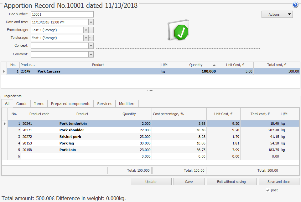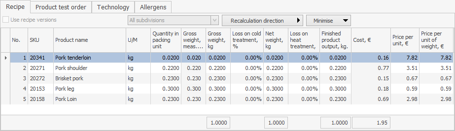 Rozważmy przykład rejestru podziału tuszy wieprzowej. Ta pozycja ma następującą recepturę: