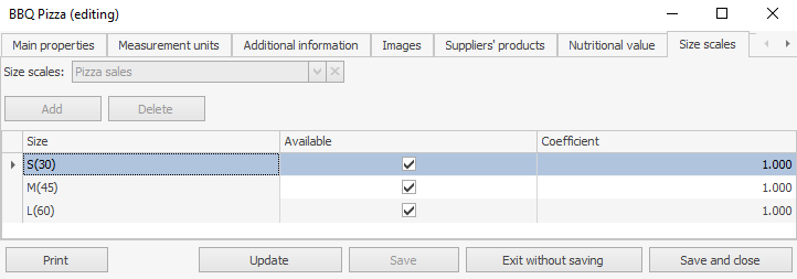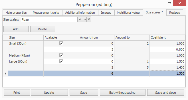 - Określ proporcje rozmiarów. Wartości norm zużycia określone w recepturze przedmiotu zostaną pomnożone przez tę wartość. W efekcie otrzymasz ilość składnika, która zostanie odpisana ze stanu magazynowego podczas sprzedaży dania.