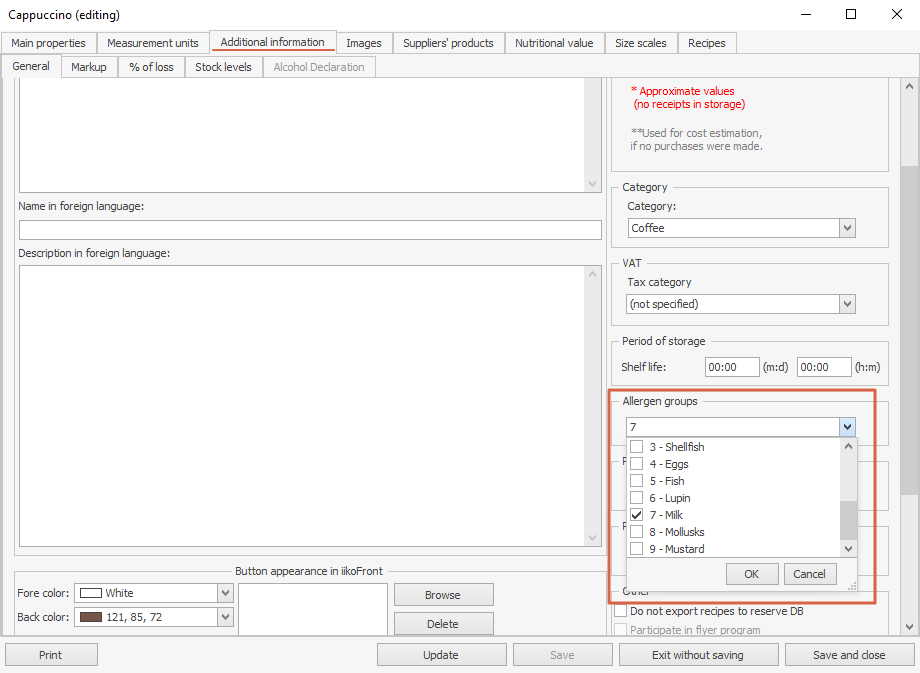 ![]() | Jeśli alergeny są określone w rekordzie pozycji, ale jednocześnie ta pozycja ma recepturę pokazującą składniki alergenne, lista alergenów zostanie sporządzona na podstawie receptury, ponieważ ma ona wyższy priorytet. |