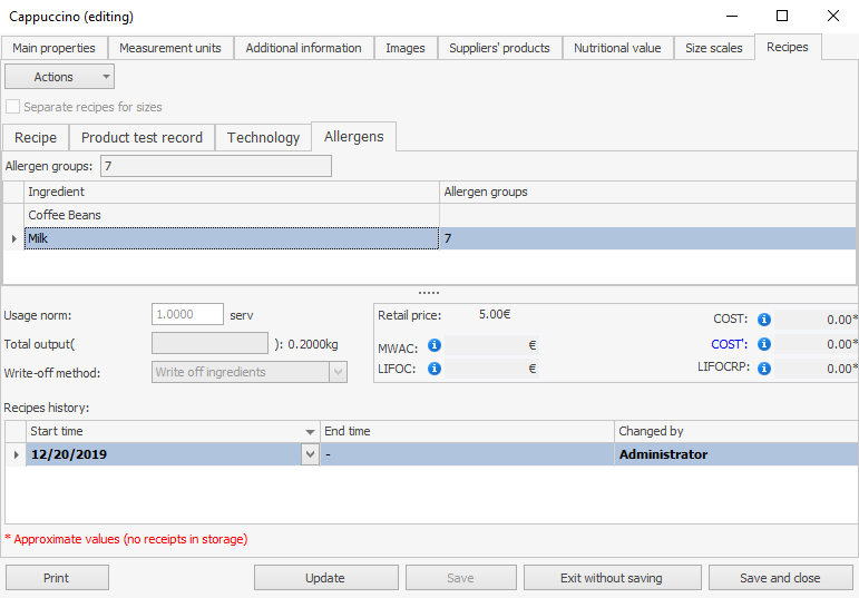 Pozycja może nie mieć receptury, w takim przypadku jej skład definiowany jest przez schemat modyfikatorów. Alergeny zawarte w modyfikatorze zależą od jego składników. Alergeny zawarte w pozycji zależą od jej modyfikatorów.