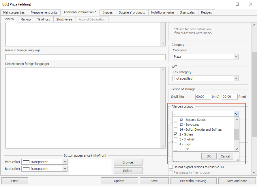 Jeśli nie używasz receptur, możesz określić wszystkie alergeny bezpośrednio w rekordzie pozycji lub modyfikatora.