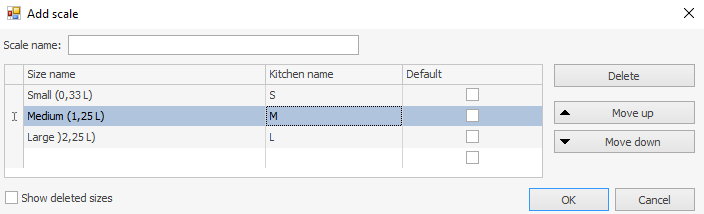 Menu sklepu może zawierać pozycje, które można sprzedawać w różnych rozmiarach. Koszt końcowy przedmiotu oraz ilość użytych składników zależą od tego. W takich przypadkach książka odniesienia Skale rozmiarów pomaga utworzyć listę magazynową bez konieczności tworzenia różnych komponentów dla każdej opcji, redukując ją do jednego przedmiotu. Na przykład Coca-Cola jest sprzedawana w kubkach 0,3l i 0,5l, a pizza ma różne średnice – od 23 do 40 cm. Aby wprowadzić taki przedmiot do książki odniesienia, należy utworzyć skalę rozmiarów i wybrać ją w karcie listy magazynowej przedmiotu. Następnie, podczas dodawania takiego przedmiotu do zamówienia, można wybrać wymagany rozmiar z listy.