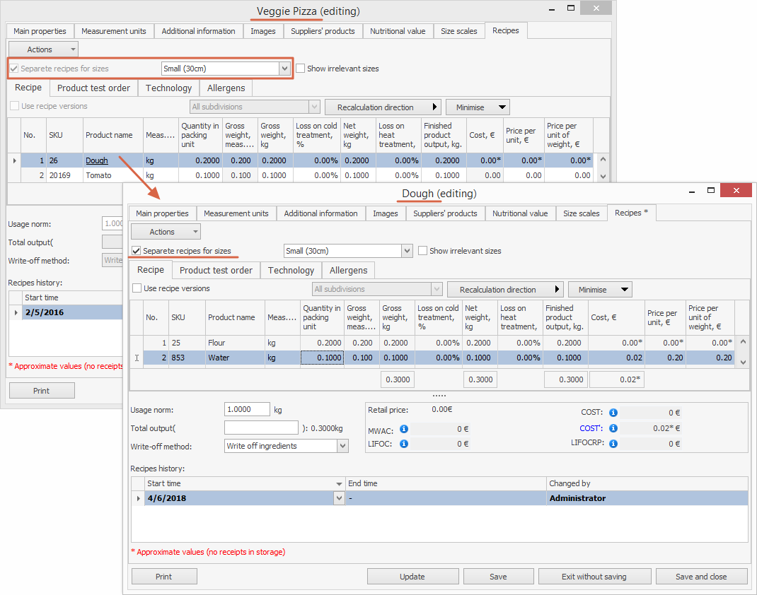 - Sprzedajesz pizzę w trzech różnych rozmiarach: S, M i L. Każdy rozmiar ma swój przepis. Pizza ma ciasto, które jest rozchodowane jako składniki (w różnej ilości dla każdego rozmiaru). W takim przypadku półprodukt Dough musi mieć tę samą skalę rozmiarów co pizza oraz osobny przepis dla każdego rozmiaru. Wtedy, sprzedając pizzę S, składniki ciasta Dough S określone w odpowiednim przepisie zostaną rozchodowane (zarejestrowane). Jeśli nie określisz skali rozmiarów dla ciasta, musisz dodać jeden przepis dla wszystkich. Składniki zostaną rozchodowane według tego wspólnego przepisu.