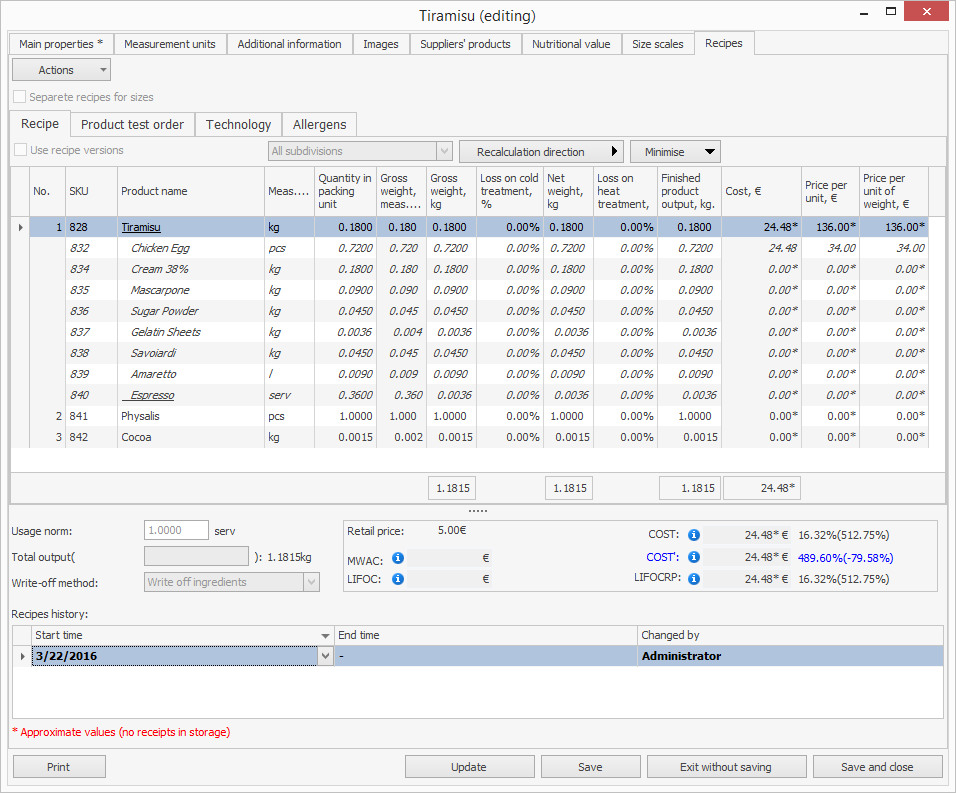- Jeśli tworzysz przepis, którego waga wyjściowa nie jest równa sumie wag wszystkich składników (na przykład nie uwzględniłeś wagi użytej wody lub przepis jest na kilka porcji), określ Normę zużycia. Domyślnie jest to „1”, czyli kalkulacja jest wykonywana dla jednej podstawowej jednostki miary.