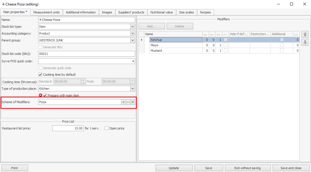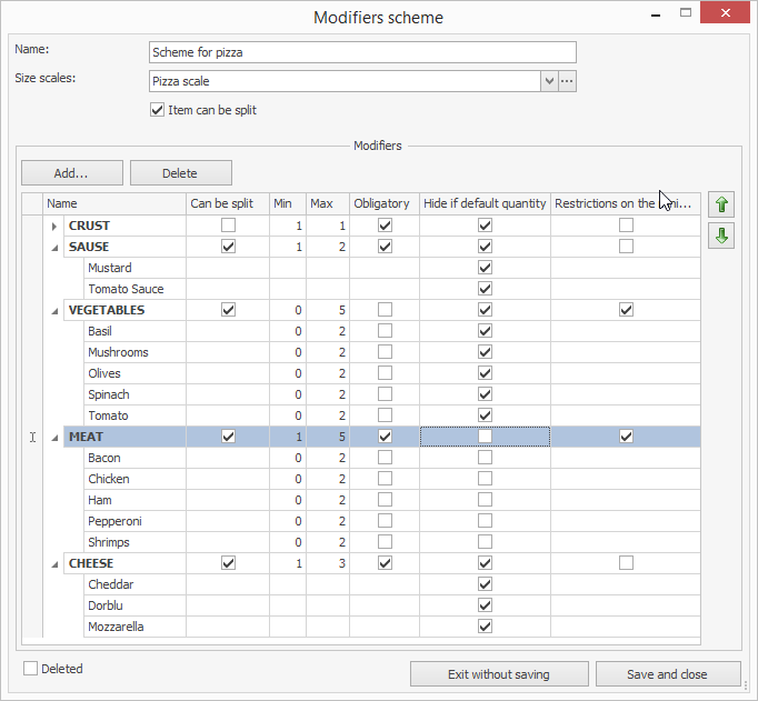 Przepisy dań są tworzone za pomocą schematów modyfikatorów. Tutaj można ustawić modyfikatory obowiązkowe, ich minimalną i maksymalną liczbę oraz inne ograniczenia.