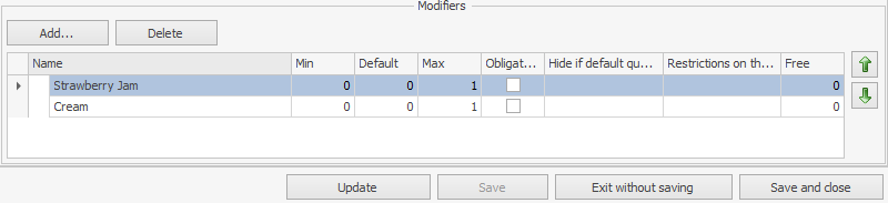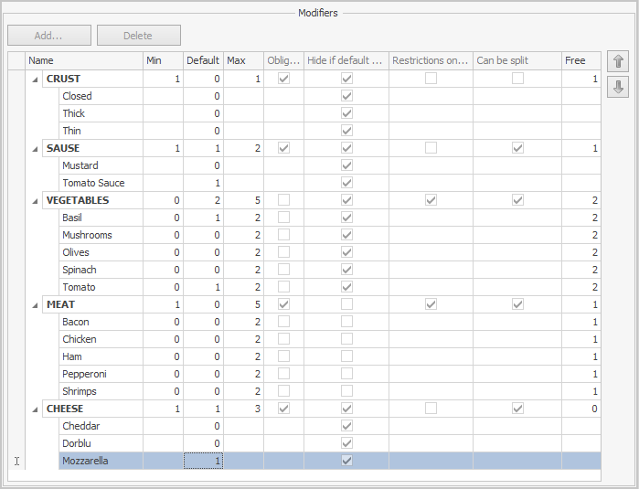 Atrybut Domyślnie. Można określić modyfikatory, które za każdym razem będą dodawane do zamówienia wraz z pozycją. W tym celu wpisz liczbę takich modyfikatorów naprzeciwko wymaganej pozycji w kolumnie Domyślnie. Dla prostych modyfikatorów wartość ta musi być większa lub równa wartości Min oraz mniejsza lub równa wartości Max. Dla grupowych modyfikatorów domyślna liczba jest ustawiana osobno dla każdej pozycji grupy, a minimalna liczba dla całej grupy. Dlatego wartość domyślna dla pojedynczej pozycji może być mniejsza niż minimalna lub nawet zerowa.