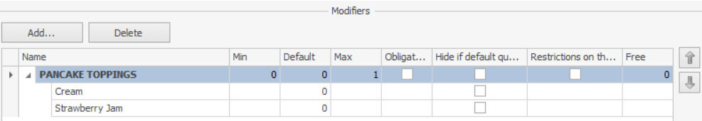Maksymalna i minimalna ilość. Domyślnie dla każdego wybranego modyfikatora minimalna ilość jest ustawiona na 0 (co oznacza, że nie jest obowiązkowy), a maksymalna na 1. Aby zmienić limity, wpisz wymagane wartości w kolumnach Min i Max.
