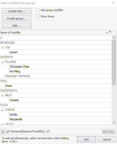 - Wybierz jeden (lub kilka) modyfikatorów lub grup i kliknij Dodaj. Użyj paska wyszukiwania, aby szybko znaleźć wymagany modyfikator.
