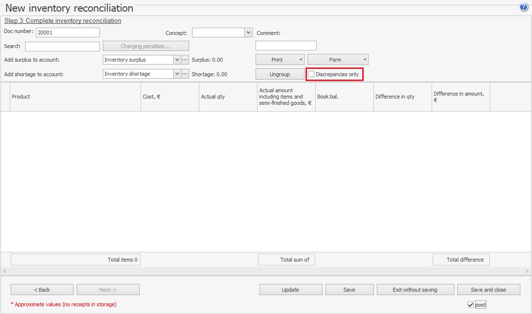 Dokument inwentaryzacji zostanie automatycznie zapisany po obliczeniu stanu księgowego przynajmniej dla jednej pozycji.