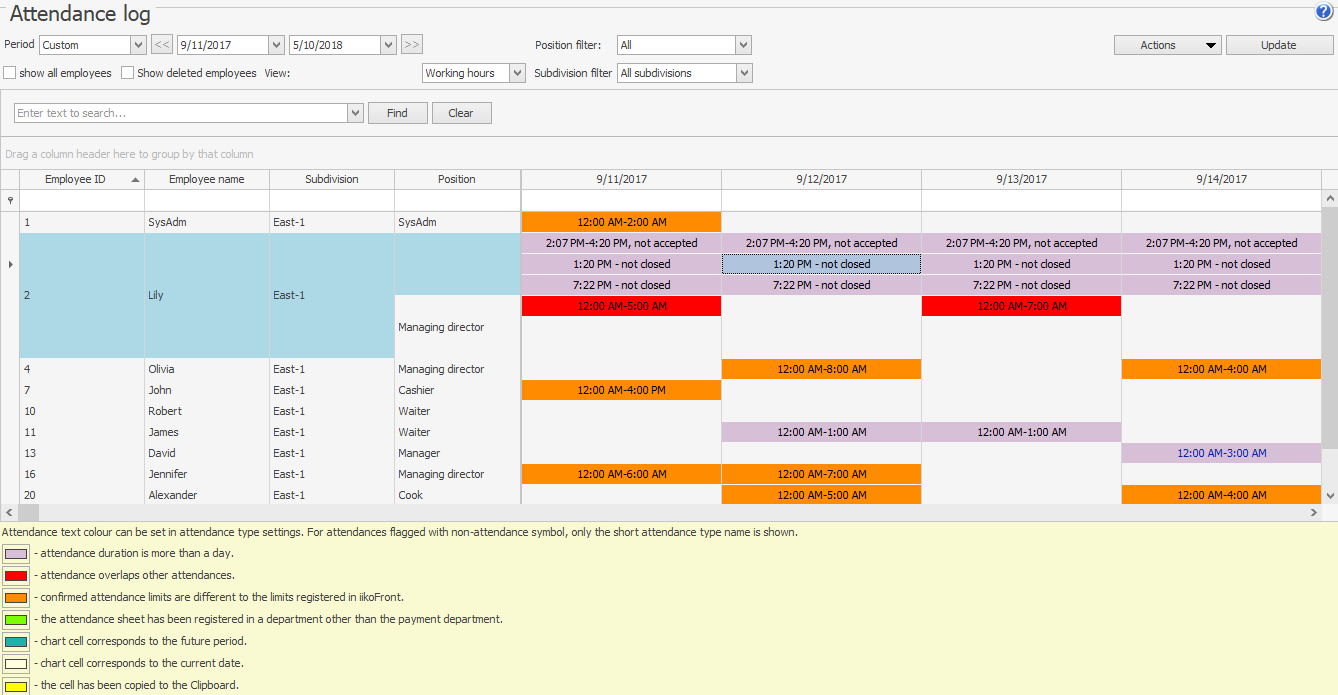 ![]() | Typ dziennika - Godziny pracy. Zarejestrowane w Syrve POS godziny wejścia/wyjścia. Kolor czcionki jest określany przez typ obecności. Wszystkie obecności domyślnie są oznaczone jako Przepracowane, a ich ramy czasowe podane są na czarno. |
